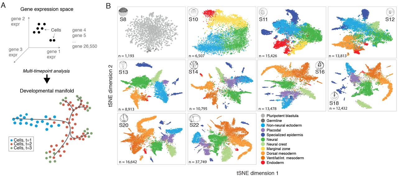(A) Single-cell transcriptomes represent points in a high-dimensional gene expression space. By collecting single-cell transcriptomes over time of embryo development, it is possible to infer a continuum gene expression manifold connecting cell states across all lineages. (B) Summary of scRNA-seq developmental timecourse including 136,966 single-cell transcriptomes sampled over ten embryonic stages (S8-22). tSNE plots show increasing cell population structure over time. Colors indicate major tissues grouped by germ layer.