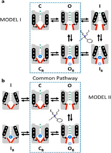Figure 1. Working models: distinct trap-door scenarios in Shaker and Kv4.1 channels.(a) Cartoon representation of activation and P/C-type inactivation mechanisms in Shaker Kv channels (Model I). For clarity, only two opposing subunits of a Kv channel tetramer are represented in the cartoons. Top and bottom are the extracellular and intracellular sides of the channel, respectively. Voltage sensors (black rod with plus signs) undergo a voltage-dependent conformational change that controls the state of the intracellular activation gate (red bars). S4–S5 linkers (black elbows) interact with the activation gate to transmit the movement of the voltage sensors to the activation gate. Once this gate opens, the Kv channel allows transmembrane K+ flow (green circles) driven by an electrochemical potential. Closing of the activation gate traps the QA ion as shown by Holmgren et al.4. However, inactivation occurs at the external selectivity filter, which does not close the internal activation gate and, therefore, there is no QA ion trapping by inactivation. (b) Cartoon representation of a putative activation-inactivation mechanism in Kv4.1 channels (Model II). Note that closing of the internal gate traps the QA ion. Additionally, disconnecting the voltage sensors from the activation gate inactivates the channel as proposed by Shin et al.37 and maintains the trapped state. The dashed perimeters enclose common pathways in Models I and II. |