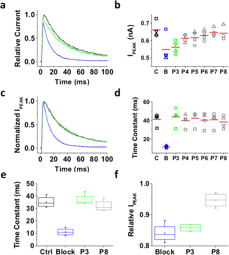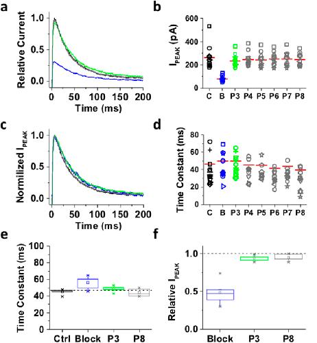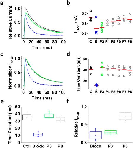 Figure 4. Inactivation of the ternary Kv4.1 channel complex traps internally applied bTBuA.The ternary Kv4.1 channel complex was heterologously expressed in Xenopus oocytes as explained under Methods. This complex includes the accessory subunits KChIP-1 and DPP6. (a) Inside-out macropatch outward currents evoked as described in Figs 2 and 3 legend. (b) Magnitude of peak currents in five consecutive iterations of the pulse protocol. Additional details as described in Fig. 3 legend. (c) Scaled and normalized currents from panel (a). (d) Time constants of decay from the currents evoked by the test pulses as explained in Fig. 3 legend. The reported time constant is the weighted average of the double exponential best-fit time constants. (e) Box plots of the time constants of current decay during blockade by bTBuA (blue box), after washout (green box) and from the currents evoked by P8 (Nâ=â5 patches; 5â40 iterations each). (f) Box plots of the peak current amplitudes during blockade by bTBuA (blue box), after washout (green box) and from the currents evoked by P8 (Nâ=â5 patches; 5â40 iterations each). On average, the peaks of currents evoked by P3 and P8 are significantly different (Kruskal-Wallis, pâ<â1.3âÃâ10â11). |