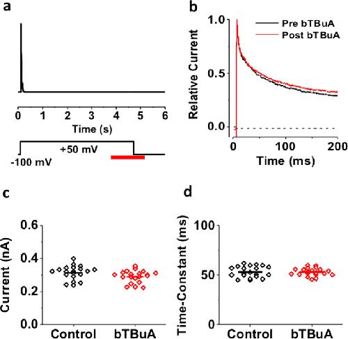 Figure 7. Inactivation of the ternary Kv4.1 channel complex prevents internal access of bTBuA to the pore.(a) Schematic of experimental protocol. Current was evoked by a 5-s step depolarization from −100 to +50 mV to ensure complete steady-state inactivation. The intracellular side of the patch was exposed to 100 μM intracellular bTBuA for a total of 1.5 s (red bar). The application began once current inactivation had reached steady-state, and continued for 1 s at +50 mV. The exposure to bTBuA was then terminated 500 ms after repolarizing the membrane to −100 mV. To test whether bTBuA had any effect, the same pulse was subsequently repeated while the inside patch was bathed in control intracellular solution. (b) Overlay of macropatch currents before (black) and after (red) intracellular exposure to bTBuA. (c) Comparison of peak currents before (control) and after (bTBuA) exposure (20 iterations of the pulse sequence on the same macropatch). (d) Comparison of weighted time constant of decay from currents before (control) and after (bTBuA) exposure (same experiment, 20 iterations). Horizontal lines in (c,d) indicate mean values. |