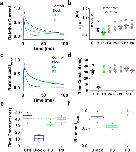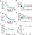 Figure 5. Lengthening the P2–P3 interval does not change block-trap-escape pattern produced by inactivation of the ternary Kv4.1 channel complex.(a) Inside-out macropatch outward currents evoked by a step to +50 mV from a holding voltage of −100 mV. The overlaid traces depict the current profile before (black), during (blue) and after (green and gray) exposure of the intracellular side of the channel to 100 μM bTBuA. The exposure to the QA ion began before the step depolarization and was terminated after macroscopic inactivation reached steady-state (Fig. 2). Note that no exposure was allowed during the repolarizing step that closes the channels. (b) Magnitude of peak currents in four consecutive iterations of the experiment described above. Pulses P1 (C, Control), P2 (B, Block) and P3–P8 evoke the currents as explained in Fig. 2. Critically, the interval between P2 and P3 was prolonged from 5 s (Fig. 4) to 40 s to eliminate the possibility of apparent QA ion trapping resulting from lack of recovery from inactivation at P3. (c) Scaled and normalized currents from panel (a). (d) Time constants of decay from the currents evoked by the test pulses as explained above for panel (a). (e) Box plots of the time constants of current decay during blockade by bTbuA (blue box), after washout (green box) and from the currents evoked by P8 (N = 5 patches; 4–12 iterations each). (f) Box plots of the relative peak current amplitudes during blockade by bTbuA (blue box), after washout (green box) and from the currents evoked by P8 (N = 5 patches; 4–12 iterations each). On average, the peaks of currents evoked by P3 and P8 are significantly different (Kruskal-Wallis, p < 0.001). |