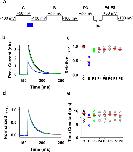 Figure 3. Inactivation of the Shaker-IR T449K channel cannot trap internally applied bTBuA.The mutant Shaker-IR T449K was heterologously expressed in Xenopus oocytes as explained under Methods. (a) Inside-out macropatch outward currents evoked by a step to +50 mV from a holding voltage of −100 mV. The overlaid traces depict the current profile before (black), during (blue) and after (green and gray) exposure of the intracellular side of the channel to 100 μM bTBuA. The exposure to the QA ion began before the step depolarization and was terminated after macroscopic inactivation reached steady-state (Fig. 2). Note that no exposure was allowed during the repolarizing step that closes the channels. (b) Magnitude of peak currents in two consecutive iterations of the experiment described above. Pulses P1 (Control, C), P2 (Block, B) and P3–P8 evoke the currents as explained in Fig. 2. (c) Scaled and normalized currents from panel (a). (d) Time constants of decay from the currents evoked by the test pulses as explained above for panel (a). Generally, one-two exponentials were sufficient to describe this decay. When the sum of two exponentials yielded the best fit, the reported time constant is the weighted average of the best-fit time constants. (e) Box plots of the time constants of current decay during blockade by bTBuA (blue box), after washout (green box) and from the currents evoked by P8 (N = 5 patches; 1–3 iterations each). (f) Box plots of the relative peak current amplitudes during blockade by bTBuA (blue box), after washout (green box) and from the currents evoked by P8 (N = 5 patches; 1–3 iterations each). On average, the peaks of currents evoked by P3 and P8 are not significantly different (Kruskal-Wallis, p = 0.37). |