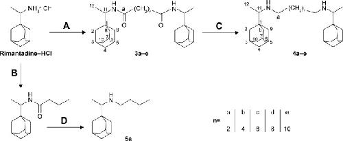 Figure 1. Synthetic scheme for the preparation of compounds 2a–e.Notes: Reaction conditions: (A) oxalyl chloride, catalytic dimethylformamide, CHCl3, 4 hours; (B) amantadine, triethylamine, CHCl3, 16 hours; (C) 1 M borane–tetrahydrofuran complex, reflux 9 hours.