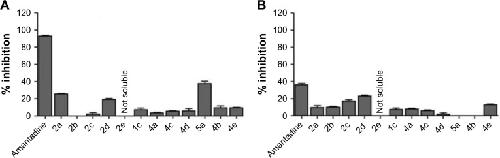 Figure 3. M2-inhibitory activities of dimeric adamantanes.Notes: Evaluation of inhibitory activity of dimeric adamantane compounds on wild-type (A) and S31N mutant (B) M2 proteins. M2 protein was expressed in Xenopus oocytes and the compounds’ inhibitory activity measured using the two-electrode voltage-clamp technique at 100 µM concentration.