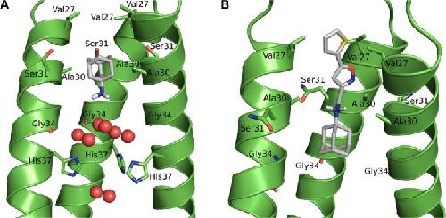 Figure 4. Inhibition of the influenza M2 proton channel.Notes: (A) Structure of amantadine (gray) in complex with M2 wild-type protein, as determined by solid-state nuclear magnetic resonance (Protein Data Bank [PDB] 2KQT),31 with the water molecules seen in the high-resolution crystallographic structure (PDB 3LBW)30 superimposed (red spheres). (B) Inhibition of amantadine-resistant M2-S31N protein by an isoxazole drug (PDB 2LY0).36 The adamantane cage is shifted downward in the structure of the S31N-mutant form, due to the constricted pore size.