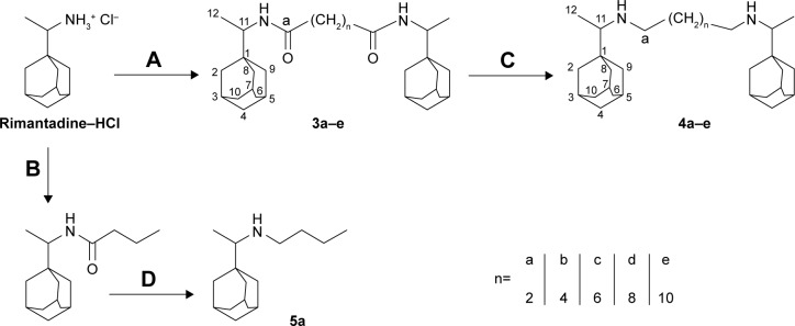 Figure 2. Synthetic scheme for the preparation of compounds 4a–e.Notes: Reaction conditions: (A) HO2C-(CH2)n-CO2H, 1-ethyl-3-(3-dimethylaminopropyl)carbodiimide HCl, hydroxybenzotriazole, diisopropylethylamine in THF, 16 hours; (B) butyric acid, 1-ethyl-3-(3-dimethylaminopropyl)carbodiimide HCl, hydroxybenzotriazole, diisopropylethylamine in THF, 16 hours; (C, D) borane–THF complex in dry THF, reflux 9 hours.Abbreviation: THF, tetrahydrofuran.