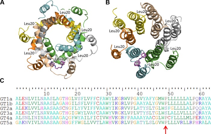 Figure 5. J6 p7 hexameric structure model 1 (A) and model 2 (B).Notes: Overlay of the docked poses of amantadine (gray) and compound 2a (magenta). Side-chain atoms of Leu20 are shown as sticks. (C) Sequence alignment of p7 protein in GT5a and the five GTs under study – 1a, 1b, 2a, 3a, and 4a – showing the position of Pro49 indicated by the red arrow.Abbreviation: GT, genotype.