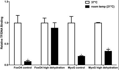 Fig. 6. The effects of adjusting temperature on the transcription factor-DNA binding affinities of FoxO4 and MyoG. Transcription factor-DNA binding was measured at 37 and 21â¯Â°C (room temperature) at the control and high dehydration sampling points for FoxO4 and MyoG. Modified DPI-ELISA absorbance readings were corrected by subtraction of negative controls containing no protein, and values were expressed relative to 37â¯Â°C for FoxO4 and MyoG at both sampling points. Histograms show mean relative valuesâ¯Â±â¯S.E.M., nâ¯=â¯4 independent biological replicates for both experimental conditions. Data was analyzed using unpaired t-tests (pâ¯<â¯0.05); to test for the effect of temperature change on each target at each sampling point, *indicates a significant difference from 37â¯Â°C.