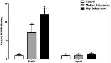 Fig. 3. Changes in binding of the transcription factors FoxO4 and MyoG to DNA-binding elements designed for their respective consensus sequences in the skeletal muscle of X. laevis during dehydration stress. DNA-Protein Interaction (DPI)-ELISA absorbance readings were corrected by subtraction of negative controls containing no protein and values were expressed relative to EC. Histograms show mean relative valuesâ¯Â±â¯S.E.M., nâ¯=â¯4 independent biological replicates for each of the three experimental conditions. Data was analyzed using a one-way analysis of variance with a post hoc Tukey's test (pâ¯<â¯0.05); for each parameter measured, values that are not statistically different from each other share the same letter notation.