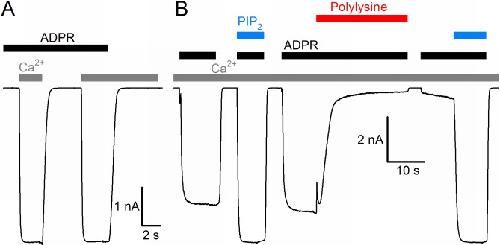 Figure 1. Basic functional properties of the Nematostella vectensis (nv) TRPM2 channel.(A) Macroscopic inward Na+ currents in an inside-out patch excised from a Xenopus laevis oocyte overexpressing nvTRPM2, evoked by superfusion of the cytoplasmic patch surface with 100 μM ADPR (black bar) plus 40 μM free Ca2+ (gray bars); extracellular (pipette) [Ca2+] was ~1 nM, membrane potential was â20 mV. (B) Effects of 25 μM dioctanoyl-PIP2 (blue bars) on nvTRPM2 channel currents before and after exposure to 15 μg/ml polylysine (red bar). Conditions as in (A). |