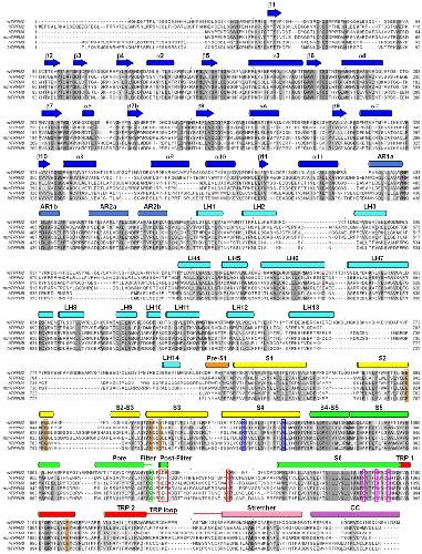 Figure 2âfigure supplement 3. Multiple sequence alignment of TRPM proteins.Sequence alignment of TRPM2, TRPM4, TRPM5, and TRPM8 channel orthologs (h: human, nv: Nematostella vectensis, mm: Mus musculus, fa: Ficedula albicollis) predicted by Clustal Omega (Li et al., 2015), and manually adjusted in the pore region. Conserved residues are shaded according to percentage of identity using Jalview (Waterhouse et al., 2009). Secondary structure elements are shown for nvTRPM2 above the sequences, and colored according to Figure 2. Colored boxes identify residues discussed in the text: residues involved in Ca2+ coordination (orange boxes), conserved arginines in helix S4 (blue boxes), residues that form the post-filter helix in nvTRPM2, and that corresponding to K1047 in nvTRPM2 (red boxes), negative residues in nvTRPM2 inner vestibule (pink boxes). |