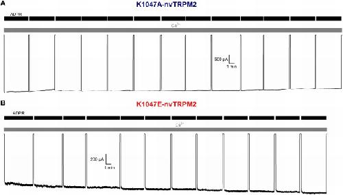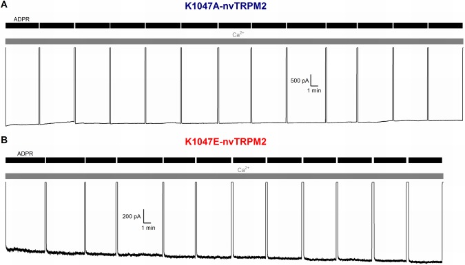 Figure 3—figure supplement 2. Disruption of post-filter salt bridge does not cause inactivation.(A–B) Lack of inactivation of nvTRPM2 channels in which the E1042-K1047 salt bridge has been disrupted by mutation K1047A (A) or K1047E (B). Membrane potential was −20 mV, currents were activated by cytosolic exposures to 100 μM ADPR (black bars) plus 125 μM Ca2+ (gray bars). |