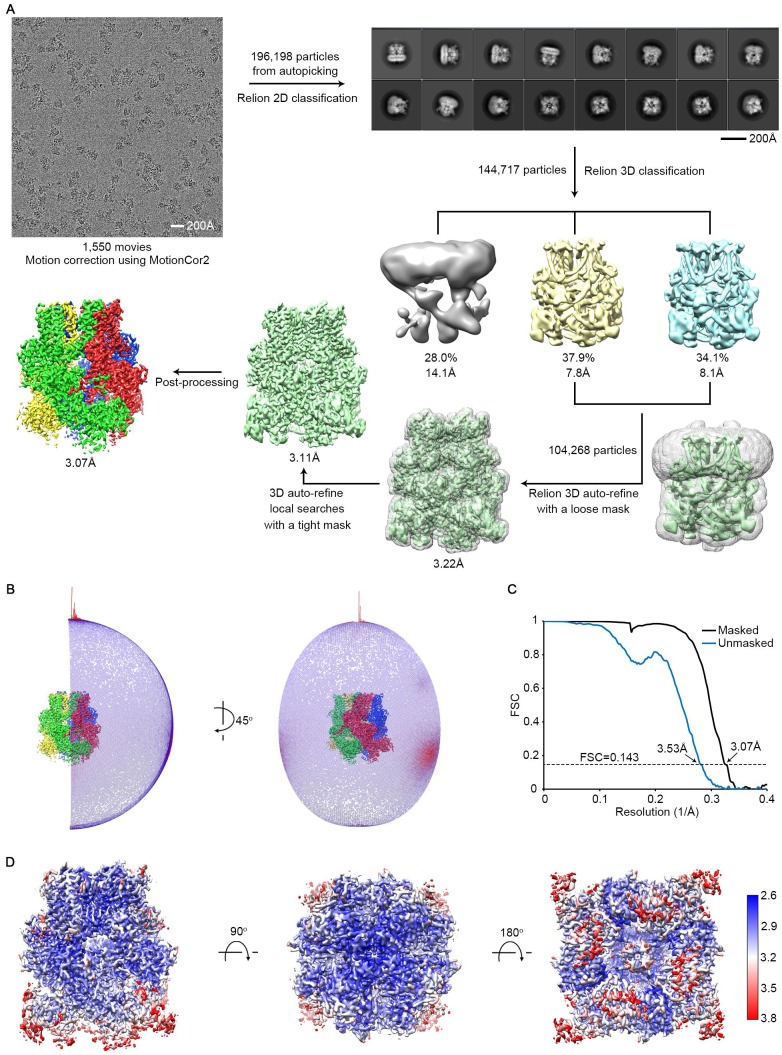 Figure 2—figure supplement 1. Cryo-EM structure determination and evaluation.(A) Flow chart of data processing. (B) Angular distributions for all the particles used in the final reconstruction. Red and higher cylinders represent more particles, blue and shorter cylinders less particles, assigned to a specific orientation. (C) Fourier shell correlation (FSC) curves between two half datasets calculated by Relion before (blue) and after (black) post-processing. (D) Local resolution estimation calculated by Blocres. |