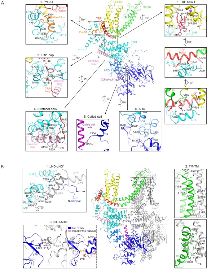 Figure 2—figure supplement 4. Intra- and inter-subunit interactions.(A) Intra-subunit interactions. Interactions between different domains within one subunit shown in cartoon representation and color-coded by domains (see Figure 2D). (B) Inter-subunit interactions. Interactions between two adjacent subunits shown in cartoon representation. One subunit is color-coded by domains (see Figure 2D), the other subunit is gray. Numbered insets in (A) and (B) magnify regions marked by dashed boxes, and display side chains involved in hydrophobic (<4.0 Å) and electrostatic interactions (<3.5 Å) as sticks. Electrostatic interactions are further indicated with dotted lines. A comparison of the ATP binding site of mmTRPM4 (PDB: 6BCO) with the corresponding region of nvTRPM2 is attached to inset three with a dotted box. |