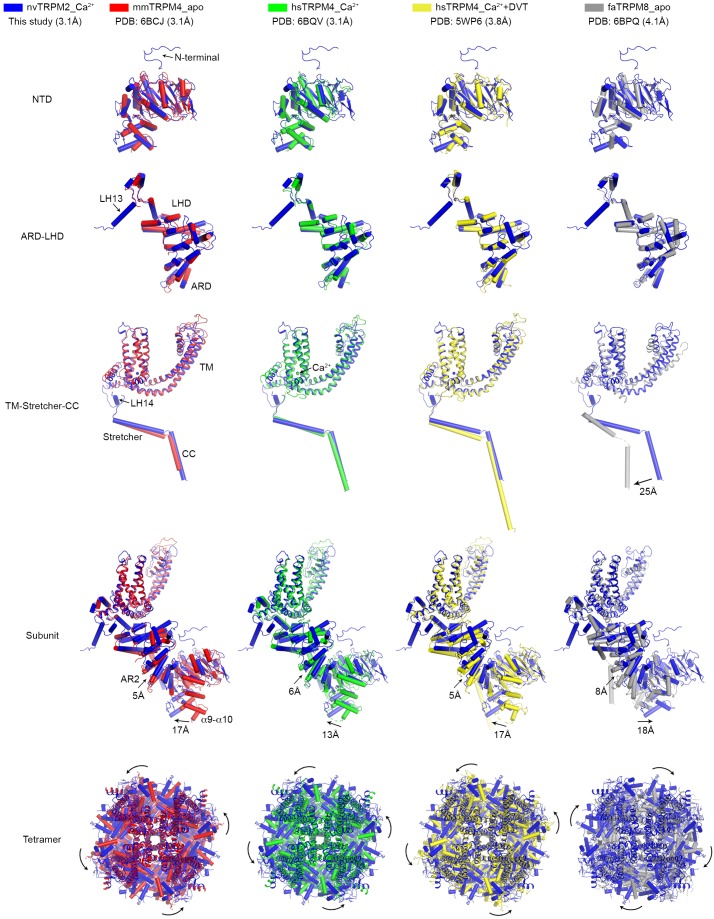 Figure 2—figure supplement 5. Structural comparisons between individual domains, one subunit, or the entire tetramer of nvTRPM2 and other TRPM family channels.The superposition was performed for individual domains (NTD, ARD-LHD, and TM-Stretcher-CC), the integral subunit, as well as the entire tetramer. The root-mean-square deviations (RMSDs) between nvTRPM2 (blue) and mmTRPM4_apo (red, PDB: 6BCJ), hsTRPM4_Ca2+ (green, PDB: 6BQV), hsTRPM4_Ca2++DVT (yellow, PDB: 5WP6), and faTRPM8_apo (gray, PDB: 6BPQ) are 1.9 Å (299 Cα atoms), 1.8 Å (269 Cα atoms), 2.0 Å (293 Cα atoms), and 2.2 Å (230 Cα atoms), respectively, for the NTD, 1.7 Å (248 Cα atoms), 1.6 Å (232 Cα atoms), 1.8 Å (227 Cα atoms), and 1.8 Å (222 Cα atoms), respectively, for the ARD-LHD, and 2.4 Å (318 Cα atoms), 2.4 Å (333 Cα atoms), 2.9 Å (316 Cα atoms), and 3.2 Å (207 Cα atoms), respectively, for the TM-Stretcher-CC. |