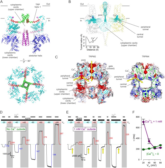 Figure 5. Cytoplasmic cavities and tunnels.(A) Architecture of the cytoplasmic cavity viewed from an angle parallel (top) or perpendicular (bottom) to the membrane plane. The NTD (blue), the LHD (cyan), the cytoplasmic ends of transmembrane helix S6 (green), TRP helix 1 and the TRP loop (red), the stretcher helix (pink), and the CC (purple) are shown as cartoon, Ca2+ ions as magenta spheres, and the E1110 side chain as sticks. In the top panel two diagonally opposing subunits are shown, in the bottom panel the NTD is removed for clarity. (B) Ribbon representation of the top and middle tiers and the CC helices, front and rear subunits omitted for clarity. Dotted mesh represents the contiguous surface that lines the pore, the upper chamber, the central and peripheral tunnels, and the Ca2+ binding sites. Inset plots the van der Waals radius of the tunnel along its central axis. (C) Longitudinal cross sections through nvTRPM2 (left) and hTRPM4 (right; PDBID:6BQV), showing connectivities and surface electrostatics for the upper chamber, a central and peripheral tunnel, and the corresponding Ca2+ binding site. Yellow arrows highlight possible pathways for Ca2+ flux. (D–E) Macroscopic nvTRPM2 currents evoked at various membrane potentials (colored bars and shading) by cytosolic exposures to 100 μM ADPR +125 μM Ca2+, in the presence of either ~1 nM (D) or 1 mM (E) free Ca2+ in the extracellular (pipette) solution. Colored curves are single exponentials fitted to the current decay time courses that follow cytosolic Ca2+ removal, colored numbers are time constants (in ms). Green dotted line marks zero-current level. Yellow arrows in (E) highlight current fractions that survive removal of cytosolic Ca2+. (F) Voltage dependence of closing time constants (mean ± SEM) upon cytosolic Ca2+ removal, in the presence (purple symbols) or absence (green symbols) of extracellular Ca2+. |