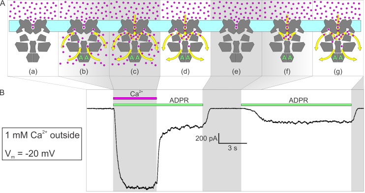 Figure 6. Activation by ADPR of nvTRPM2 current in the presence of external but absence of cytosolic Ca2+.(A) Cartoon interpretation of the molecular events that occur during consecutive time intervals (sections a-g, also identified by intermittent gray shading in (A)-(B)) of the current recording in (B). Membrane, light cyan; nvTRPM2 protein, dark gray; Ca2+ ions, magenta spheres; ADPR, green letters ‘A’; direction of Ca2+ flow, yellow arrows. (B) In the presence of 1 mM external Ca2+, at −20 mV membrane potential, a fraction of the macroscopic nvTRPM2 current evoked by cytosolic exposure to 100 μM ADPR +125 μM free Ca2+ survives cytosolic Ca2+ removal, and subsides only upon removal of ADPR (see Figure 5E). A second application of 100 μM ADPR, without cytosolic Ca2+, activates a current comparable to that which survived prior Ca2+ removal. Note delayed current activation following exposure to ADPR alone. |