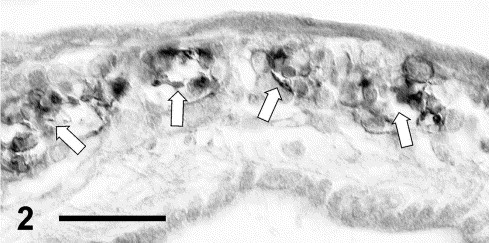 CERN-874 labelling in the pineal gland. Pinealocytes form rossette-like aggregates (arrows) showing immunopositive outer segments facing the inside. Bar: 50 μm.