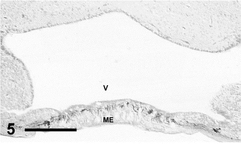 Cone-opsin-immunoreactive fibers in the median eminence (ME). Note that these positive fibers occupy the inner region of the ME (close to the third ventricle, V). Bar: 100 μm.