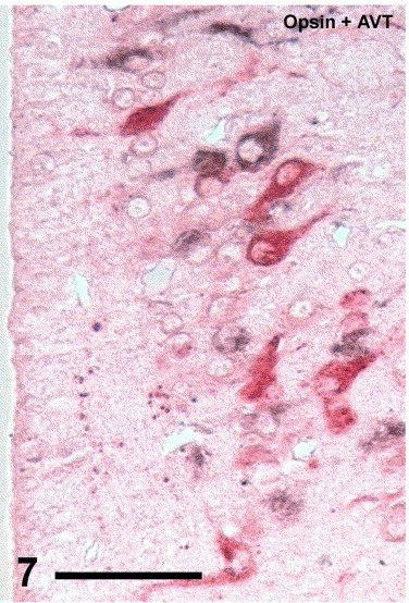 Cone-opsin/AVT double labelling in the MPON (indicated at top right corner as opsin+AVT). Dark brown stained neurons are opsin-positive, whereas vasotocinergic neurons are red. No co-localization of both antigens at any neuron (which should be intensely stained) can be observed. Bar: 50 μm.