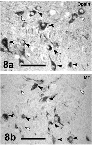 (A) and (B) represent two adjacent sections showing opsin and mesotocin (MT) IR, respectively. Note that the majority of the opsin-positive cells are also MT-labelled in the consecutive section (the black arrows point to these cells). Some exceptions (white arrows) show opsin, but not MT, immunostaining. Calibration bars: 50 μm.