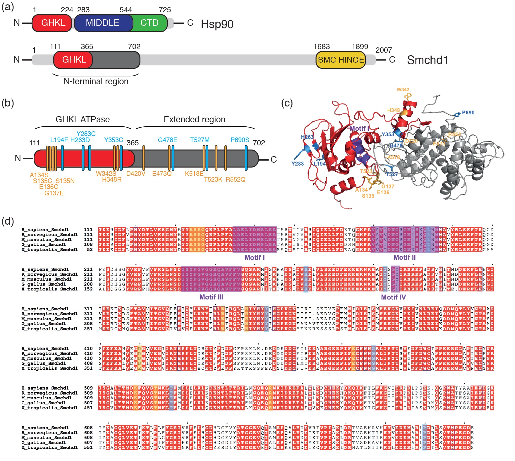 (d) Multiple sequence alignment of Smchd1 (111-702 residues) orthologue sequences from Homo sapiens,