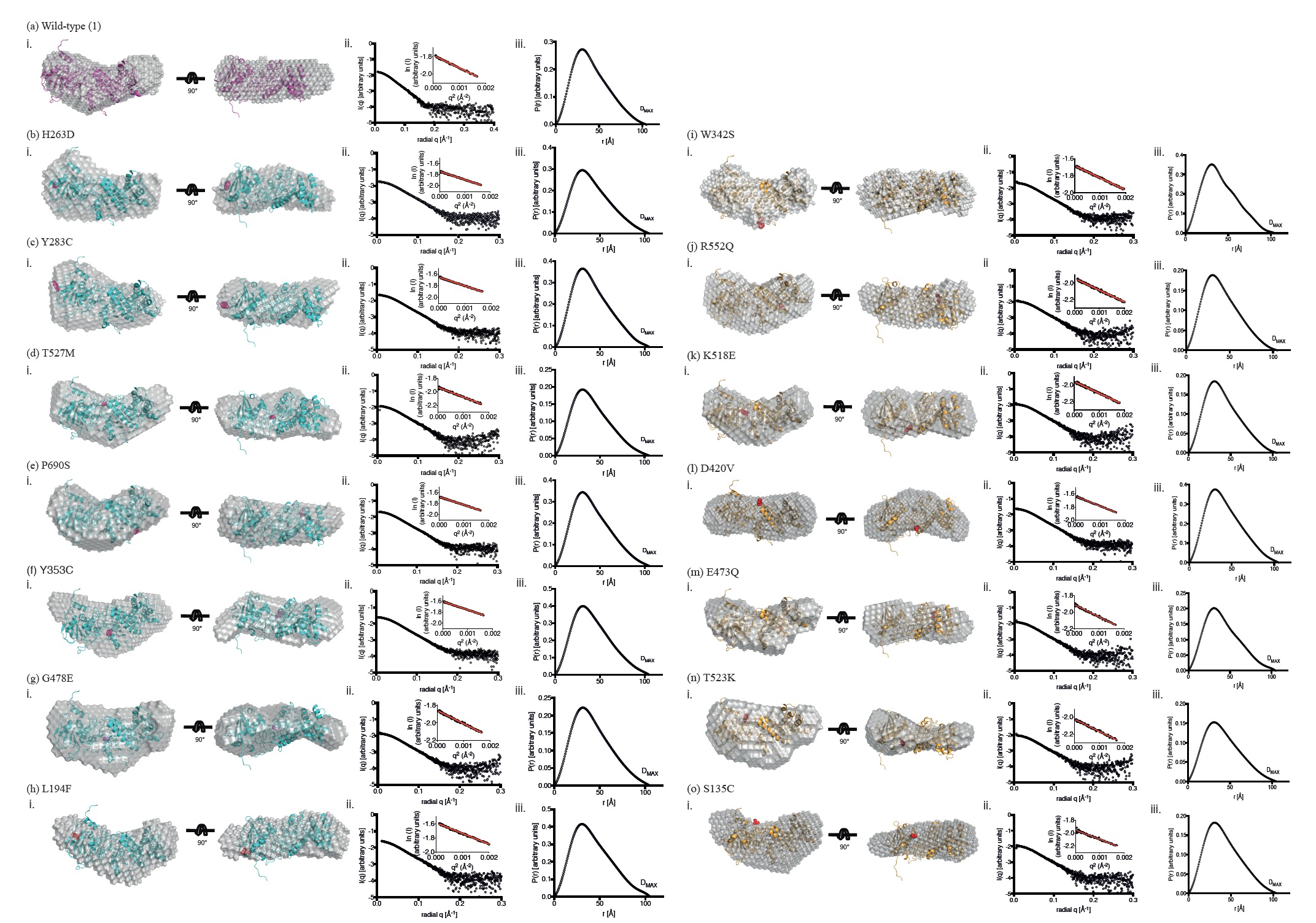 Panels (ii) depict scattering profiles, with intensity of scattered X-rays, I(q) as a function of momentum transfer, q, in Å-1, showing inset Guinier plots for the corresponding mutants, where
