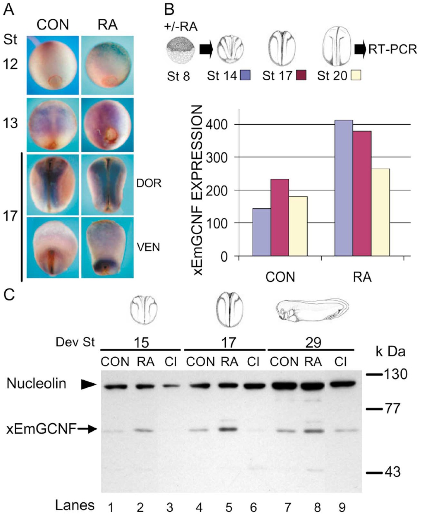 17 and 20 were plotted. (C) The amount of xEmGCNF protein is enhanced by RA and reduced by Citral, an inhibitor of RA signaling. Protein extracts of nontreated