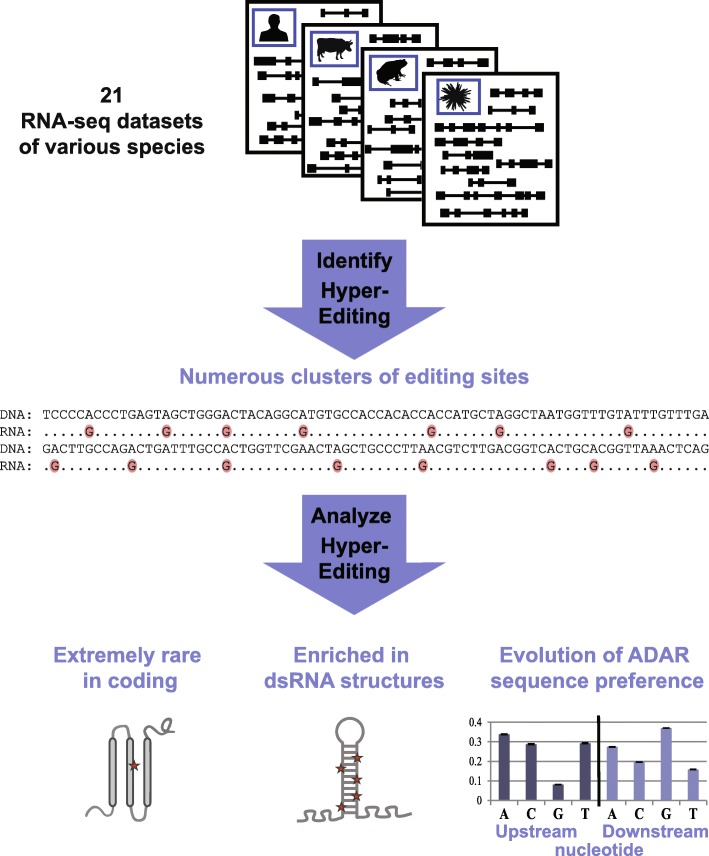 Fig. 1. Overview: analyzing hyper-editing across species. RNA-seq datasets of 21 species were screened for clusters of RNA A-to-I editing, using the hyper-editing pipeline [39]. The identified hyper-editing sites were then characterized, revealing an enrichment in putative dsRNA structures and evolution of the ADAR sequence preference