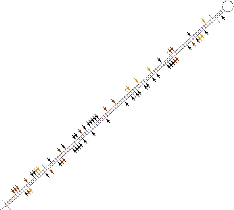 Harbinger is the most edited repeat family in Xenopus tropicalis, belonging to the DNA repeat class. The Harbinger repeats are palindromic, likely forming tight dsRNA structures. Here we show the predicted secondary structure (using MFOLD [60]) for a single representative Harbinger repeat (221-bp in length; located at GL172703: 562862-563082) which was found to be highly hyper-edited (65/77 adenosines were found hyper-edited; marked with arrows). Clearly, tight dsRNA is formed without the requirement of nearby reverse-oriented similar repeat, explaining the high level of hyper-editing in Xenopus tropicalis. We measured the editing level for each site (using all reads, including ones that were normally aligned to the region). Strongly edited sites (>30%) are marked with red arrows, moderately edited sites (1–30%) with orange arrows, and black arrows point to sites that were not found edited by the non-hyper-edited reads (or were not covered by those reads), see also Additional file 1: Figure S7