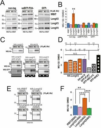 Stability of IRBIT family. (A) COS-7 cells transfected with nontag, seBFP-P2A, or GFP-tagged IRBIT family were treated with MG-132. (B) Quantitative analysis of IRBIT family in A, n = 3. Nontag LongV3 protein markedly accumulated by MG-132, compared with IRBIT, LongV2, and LongV4. Interestingly, seBFP-P2A-tag and GFP-tag masked the higher accumulation rate of LongV3 by MG-132, although the seBFP-P2A–tag cleaved off after translation by endogenous protease. **P < 0.01. (C) COS-7 cells transfected with HA-LongV3 or HA–del-N were treated with MG-132. In addition, COS-7 cells transfected with HA-LongV3 and target molecules were treated with MG-132. (D) Quantitative analysis of HA-LongV3, HA–del-N and target molecules in C, n = 3. The N-terminal deletion mutant highly accumulated to the same extent as LongV3, indicating that N-terminal–specific sequences of LongV2 and LongV4 increased protein stability. Coexpression of target molecules did not affect the accumulation rate of LongV3. *P < 0.05, **P < 0.01, #P < 0.05, ##P < 0.01, N.S., no significance. (E) COS-7 cells transfected with HA-IRBIT S68A mutant, which lacks binding activity to target molecules (3, 4, 13), and comparable mutants of Long-IRBIT were treated with MG-132. (F) Quantitative analysis of HA-IRBIT family mutants in E, n = 3. LongV3 S46A mutant significantly accumulated with MG-132, compared with IRBIT S68A, LongV2 S148A, and LongV4 S46A. **P < 0.01, ***P < 0.001. |