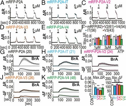 IRBIT family regulated ATP-induced Ca2+ release activity and CaMKIIα activation. IT, IRBIT; V2, LongV2; V3, LongV3; V4, LongV4. (A–E) Representative Ca2+ imaging of transfected IRBIT KO MEF cells. (F) Quantitation of Ca2+ peak amplitude (Max. ΔR) in transfected IRBIT KO MEF cells. ***P < 0.001, ****P < 0.0001. (G–K) Simultaneously imaging of FRET and Ca2+ change in transfected IRBIT KO MEF cells. (Upper) Average FRET changes (ΔR) are shown. (Lower) Average Ca2+ responses (−ΔF) are shown. BrA: 2.5 μM. (L) Quantitation of FRET amplitude (Max. ΔR) and Ca2+ peak amplitude (Max. −ΔF). *P < 0.05, **P < 0.01, N.S., no significance. |