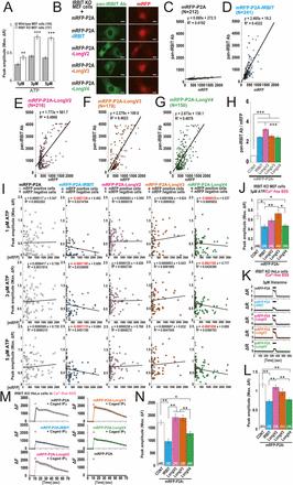 Effects of IRBIT family expression on IP3R activity. (A) Peak amplitude of ATP-induced Ca2+ changes in WT and IRBIT KO MEF cells. **P < 0.01, ***P < 0.001. (B) Transfected IRBIT KO MEF cells were stained with anti–pan-IRBIT Ab (green). (Scale bars, 10 μm.) (C−G) Scatter plots of mRFP intensity and immunosignal of anti–pan-IRBIT Ab in transfected IRBIT KO MEF cells. (H) Average ratio of pan-IRBIT Ab to mRFP in C−G. LongV2 ratio of pan-IRBIT Ab to mRFP was slightly higher than IRBIT, LongV3, and LongV4. ***P < 0.001. (I) Scatter plot of mRFP intensity and peak amplitude of ATP-induced Ca2+ changes. There was no significant correlation; however, we noticed that mRFP intensity of IRBIT- or LongV4-expressing cells, but not LongV2- or LongV3-expressing cells, have weak tendency to correlate negatively with peak amplitude of calcium transients. (J) Peak amplitude of 3 μM ATP-induced Ca2+ change in transfected IRBIT KO MEF cells under extracellular Ca2+-free condition. *P < 0.05, **P < 0.01. (K) Representative Ca2+ imaging of 3 μM histamine-induced Ca2+ change in transfected IRBIT KO HeLa cells (16). (L) Quantitation of Ca2+ peak amplitude in transfected IRBIT KO HeLa cells. The total cell numbers are indicated. In both MEF cells stimulated with ATP and HeLa cells stimulated with histamine, IRBIT and LongV4 significantly inhibited the IP3-induced Ca2+ release compared with control cells expressing mRFP-P2A alone, whereas the expression of LongV2 and LongV3 did not have an effect. **P < 0.01. (M) Average Ca2+ imaging of IP3 uncaging-induced Ca2+ change in transfected IRBIT KO HeLa cells. Arrows, photo-uncaging stimulation (1 s). Photo-uncaging clearly induced intracellular Ca2+ change with caged-IP3, but did not induce Ca2+ change in transfected IRBIT KO HeLa cells without caged IP3. (N) Quantitation of Ca2+ peak amplitude in M. The total cell numbers are indicated. Expression of IRBIT and LongV4 significantly inhibited the peak amplitude of Ca2+ changes by IP3 uncaging, whereas the expression of LongV2 and LongV3 did not have an effect. These data support that IRBIT and LongV4 inhibited IP3R activity. *P < 0.05, **P < 0.01. |