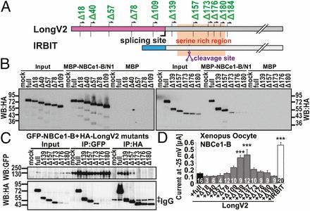 N-terminal of LongV2 disturbed the activation of NBCe1-B. (A) Schematic illustration of N-terminal deletion mutants for binding assay and electrophysiological analysis. (B) Pull-down assay of HA-LongV2 deletion mutants and MBP-tagged N-terminal region of NBCe1-B. (C) Co-IP of GFP–NBCe1-B and HA-LongV2 deletion mutants. ‡IgG bands for IP. (D) NBCe1-B–mediated currents at a holding potential of −25 mV in Xenopus oocyte injected NBCe1-B cRNA with full-length LongV2 (full), various LongV2 deletion mutants, or IRBIT. ***P < 0.001 compared with full-length LongV2. The total cell numbers were indicated in each graph. |