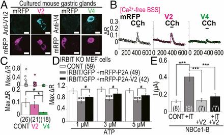 LongV4 inhibited CCh-induced Ca2+ release in gastric glands and LongV2 coexpression effected the regulation of IP3R and NBCe1-B by IRBIT. mRFP, mRFP-P2A; V2, mRFP–P2A-LongV2; V4, mRFP-P2A-LongV4. (A) Cultured gastric glands were transfected and stained with anti-LongV1/2 or anti-LongV4 Abs. (Scale bars, 10 μm.) (B) Representative Ca2+ imaging of transfected gastric glands. CCh: 100 μM. (C) Quantitation of Ca2+ peak amplitude (Max. ΔR). (Upper) Max. ΔR of each cell. (Lower) Average of Max. ΔR. The total cell numbers were indicated in each graph. *P < 0.05. (D) Peak amplitude (Max. ΔR) of ATP-induced Ca2+ release activity in transfected IRBIT KO MEF cells. The total cell numbers were indicated in each graph legend. ***P < 0.001 compared with control cells, #P < 0.05. (E) NBCe1-B mediated currents at a holding potential −25 mV in Xenopus oocyte. The total cell numbers were indicated in each graph. ***P < 0.001. |