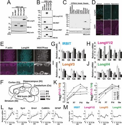 Validation of LongV4 specific antibody and IRBIT family expression. (A and B) Western blotting (WB) analysis of COS-7 cells expressing HA-IRBIT or HA–Long-IRBIT splice variants. The asterisk represents cross-reacting to a nonrelated molecule. (C) Tissue distribution of LongV4 protein expression. The asterisks represents cross-reacting to a nonrelated molecule. (D) Adult mouse stomach and brain section were stained with anti-LongV4 (cyan) and DAPI (magenta). (Scale bars, 100 μm.) (E) Adult mouse stomach section was stained with phalloidin (magenta), anti-LongV4 (cyan), and anti-HKATPase (white). [Scale bars, (Upper) 100 μm, (Lower) 5 μm.] Arrows indicate gastic lumen, arrowheads indicate basal membrane. (F−J) IRBIT family expression in developmental brain. (F) Schematic illustration of brain regions for quantitative PCR analysis. P0–14, postnatal day 0–14; 10w, 10 wk. (G−J) Gene expression levels of IRBIT family in each brain region, n = 3. The data are normalized as Hi-P0 is equal to 1. IRBIT was almost stable during postnatal brain development except in the cerebellum. LongV1/2 expression increased after birth in all regions, whereas LongV3 and LongV4 decreased. (K) The expression ratio of LongV1/2 (H) to LongV3 (I) or LongV4 (J) drastically changed during postnatal brain development. (L) Gene expression changes of markers for synaptogenesis [synaptophysin (Syp), synapsin I (SynI), glutamate ionotropic receptor AMPA type subunit 1 (Gria1), calcium calmodulin dependent kinase II alpha (CaMKIIα)] and astrocytes (GFAP) during hippocampal neuronal culture, n = 3. DIV, day in vitro. All markers for synaptogenesis increased during DIV. *P < 0.05, **P < 0.01, ***P < 0.001. (M) Gene expression changes of IRBIT and Long-IRBIT splice variants during hippocampal neuronal culture, n = 3. LongV1/2 was significantly increased at DIV 8, 12, and 16. These results indicate that gene expression of Long-IRBIT splice variants was regulated during postnatal brain development and neuronal maturation. *P < 0.05, **P < 0.01, ***P < 0.001. |