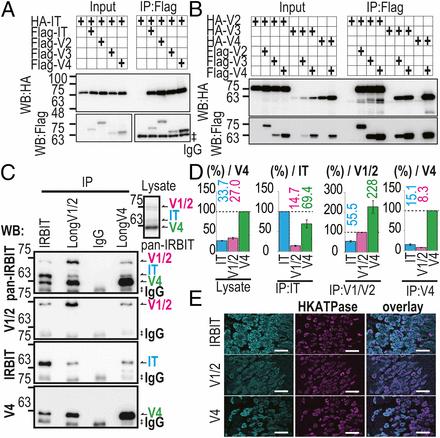 Multimer formation of IRBIT family. IT, IRBIT; V1/2, LongV1/2; V3, LongV3; V4, LongV4. (A) Co-IP of HA-IRBIT and Flag-IRBIT family. ‡IgG bands for IP. (B) Co-IP of HA–Long-IRBITs and Flag–Long-IRBITs. (C) Co-IP assay of IRBIT, LongV1/2, and LongV4 from stomach lysates. ‡IgG bands for IP. (D) Quantification of IRBIT, LongV1/2, and LongV4 by pan-IRBIT Ab in C. (E) Adult mouse stomach section was stained with anti-IRBIT, anti-LongV1/2, or anti-LongV4 Abs (cyan), and anti-HKATPase Ab (magenta). (Scale bars, 50 μm.) |