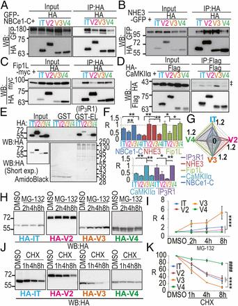 Co-IP assay for IRBIT family and target molecules and protein stability of IRBIT family. IT, IRBIT; V2, LongV2; V3, LongV3; and V4, LongV4. (A) Co-IP of HA-IRBIT family and GFP–NBCe1-C, n = 4. (B) Co-IP of HA-IRBIT family and NHE3-GFP, n = 4. (C) Co-IP of HA-IRBIT family and Fip1L-myc, n = 4. (D) Co-IP of Flag-IRBIT family and HA-CaMKIIα. ‡IgG for IP n = 3. (E) Pull-down assay of HA-IRBIT family and GST-tagged N-terminal region of IP3R1 (GST-EL), n = 4. (F) Quantification of binding assay in A–E. Data were normalized by LongV3 for A–D and normalized by LongV4 for E. R, Relative value. *P < 0.05, **P < 0.01. (G) Radar chart of each target molecules for IRBIT family. (H) Transfected COS-7 cells with HA-IRBIT family were treated with MG-132 (10 μM) or DMSO. (I) Quantitative analysis of HA-IRBIT family in H, n = 3. ****P < 0.0001. (J) Transfected COS-7 cells with HA-IRBIT family were treated with CHX (50 μg/mL) or DMSO. (K) Quantitative analysis of HA-IRBIT family in J, n = 3. ****P < 0.0001, ####P < 0.0001. |