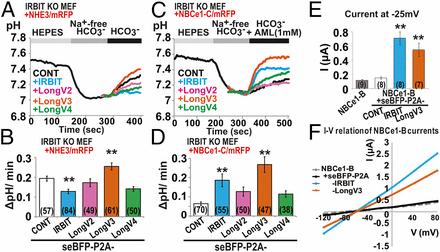 IRBIT family regulated NHE3 and NBCe1 activity. (A) Representative pH imaging of transfected IRBIT KO MEF cells with NHE3/mRFP. (B) Quantitation of intracellular pH change (ΔpH/min) after switching from Na+-free to 144 mM Na+/HCO3− buffer. The total cell numbers were indicated in each graph. **P < 0.01. (C) Representative pH imaging of transfected IRBIT KO MEF cells with NBCe1-C/mRFP. (D) Quantitation of intracellular pH change (ΔpH/min) after switching from Na+-free to 144 mM Na+ HCO3− buffer with NHE1 inhibitor, AML (1 mM). **P < 0.01. (E) NBCe1-B–mediated currents in Xenopus oocyte. Influxes of anion charges were measured at a holding potential of −25 mV. **P < 0.01. (F) Current–voltage (I–V) relationship of NBCe1-B currents in oocytes. Step pulses between Vm = −120 and 80 mV were applied. |