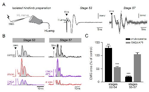Figure 6. Functional switch in hindlimb neuromuscular transmission. A. EMG recordings (HLemg) from an isolated hindlimb preparation (schematic at left) in response to single pulse (100μs) electrical stimulation (Stim) of a limb motor nerve (HL nerve) in stages 53 and 57 larvae. In each case, the black arrow indicates the beginning of the EMG response and the black trace represents the mean profile of 6 superimposed responses. Note that the trace illustration for stage 53 was taken from a 1 mM Mg2+ saline experiment. B. Integrated motor nerve-evoked HLemg responses in control (black), and under d-tubocurarine (d-tubo.; red) or CNQX+AP5 (purple) bath application to stage 53 and 57 preparations. Thick lines represent the mean response profile (SEM); the area under each curve (grey) was used to measure the response size. C. Mean (SEM) EMG response area as percentage of control response during d-tubocurarine (black) or CNQX/AP5 (grey) bath application at stages 52-54 and 55-57, respectively. ** p<0.01 and *** p<0.001, Mann–Whitney U-test. |