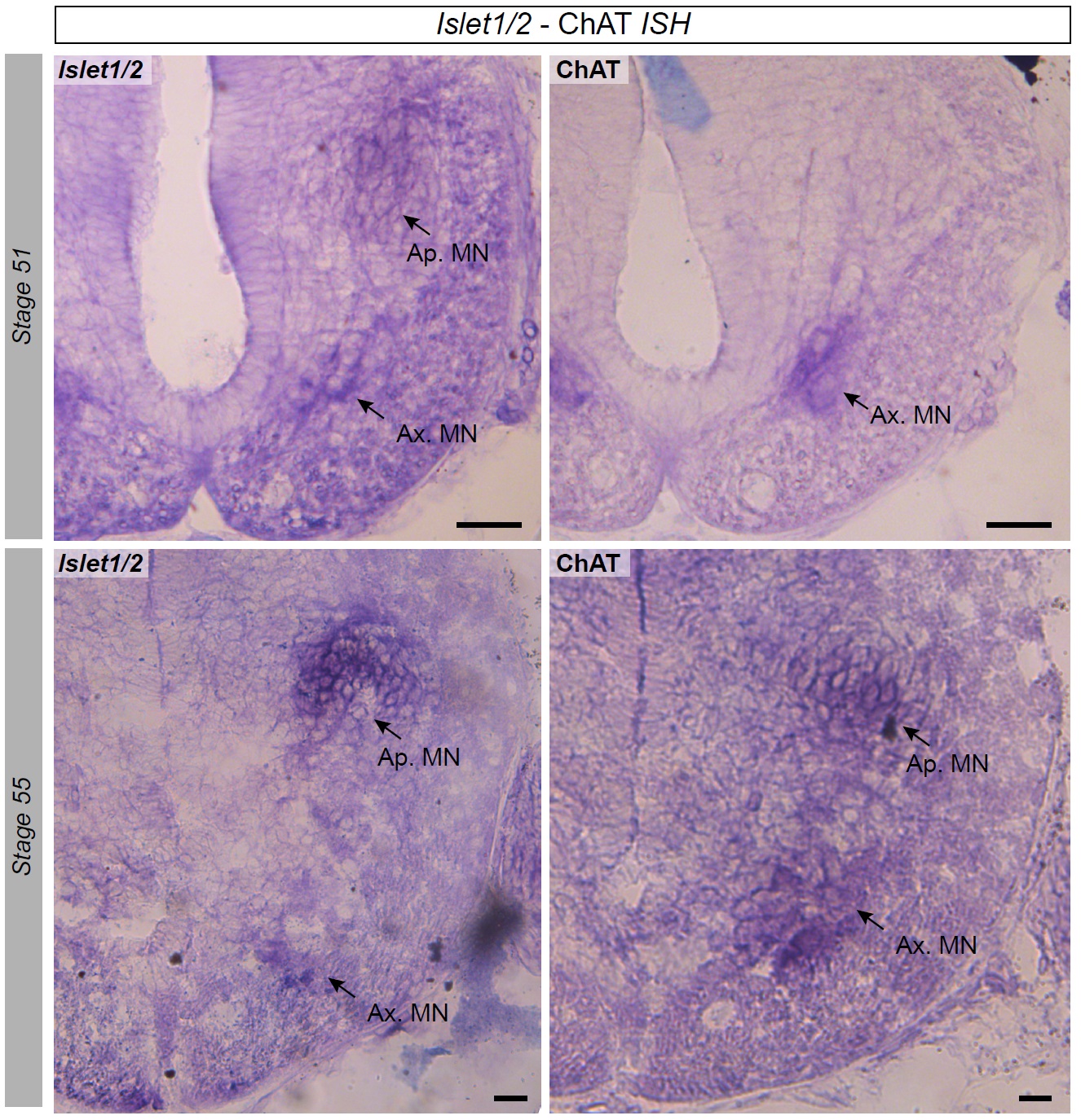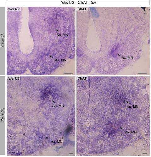 Figure 3 supplement 1. Presence of spinal Islet1 and ChAT mRNAs at different developmental stages. In situ hybridization of the two mRNAs was performed with the same protocol (see Methods). The Islet1 probe was synthesized according to Shi et al. (2009) and involved amplifying a PCR fragment of 798 pb by the primers 5â- AAGTGCAACATCGGCTTCAG-3â and 5â-GCTGTTTGGGGTATCTGGGA-3â. Despite the occasional appearance of a widespread background signal (due to differences in colorimetric reaction times), Islet1 mRNAs in darkened clusters were clearly evident in both the axial and appendicular motor columns at all developmental stages examined (stage 51 (upper left panel) and 55 (lower left panel) are illustrated), whereas ChAT mRNAs were found in limb MNs only from stage 55 onwards (c.f., upper and lower right panels). |