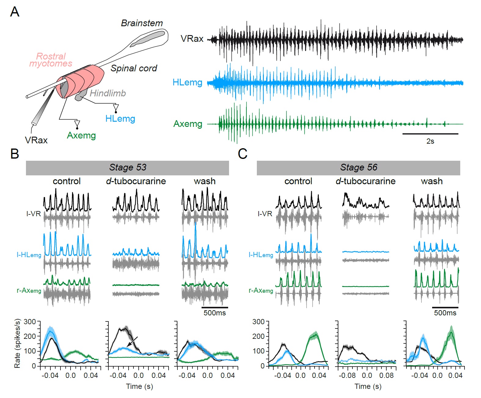 Figure 4. Switch from non-cholinergic to cholinergic limb muscle activation during axial swimming at different developmental stages. A. Rhythmic burst discharge (right panel) recorded from an axial ventral root (VRax) together with a hindlimb bud muscle (HLemg) and axial myotome (Axemg) during a spontaneous fictive swim episode in a semi-isolated stage 53 preparation (left panel). B-C. Examples of recordings before (control), during and after (wash) bath application of d-tubocurarine to a stage 53 (B) and a stage 56 (C) preparation. Lower plots in B and C show instantaneous l-HLemg (blue) and r-Axemg (green) discharge rates (spikes/s) averaged ( SEM) over 10-20 l-VRax locomotor cycles (black). Black arrow in the middle graph of B indicates persistent limb bud EMG activity occurring in phase with the ipsilateral ventral root during d-tubocurarine application, and which was no longer present at the later developmental stage (c.f., middle plot in C). |