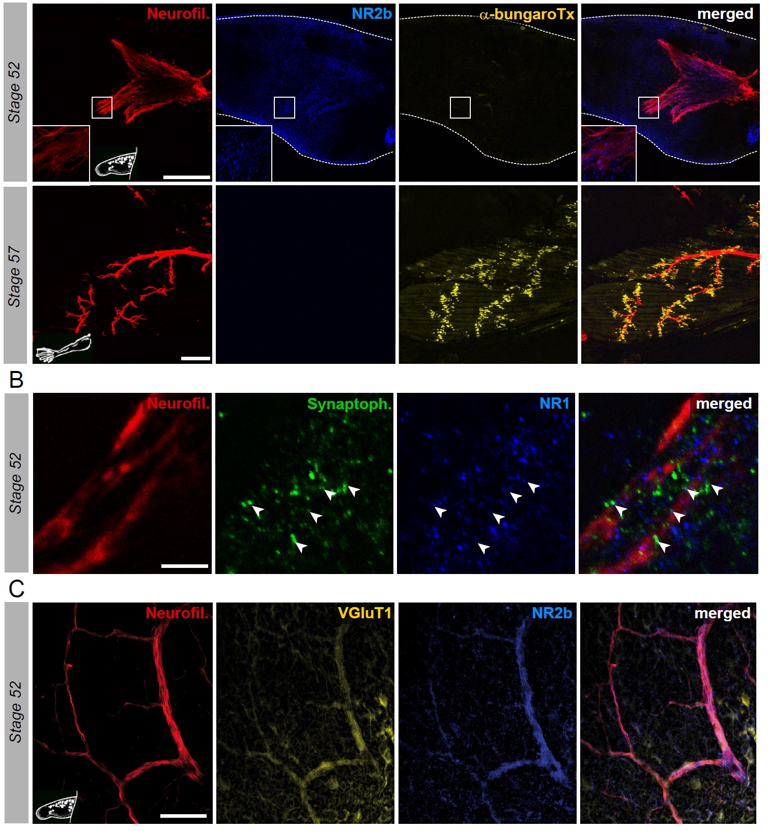 Figure 5. Switch from glutamate to acetylcholine receptors in hindlimb muscles. A. Examples of hindlimb innervation patterns and distribution of ACh nicotinic receptors in a whole-mount hindlimb bud, revealed by fluorescence immunolabeling of neurofilament associated protein (Neurofil., red), glutamate receptor (NR2b, blue) and α-bungarotoxin labeling (α-bungaroTx, yellow) respectively, at stages 52 (upper panels) and 57 (lower panels). Inset drawings at bottom left of each panel show bud morphology at the two representative larval stages. Scale bars: 200μm for stage 52, 100μm for stage 57. B. Examples of fluorescence immunolabeling against neurofilament associated protein (red), synaptophysin (Synaptoph., green) and NMDA glutamate receptor subunit 1 (NR1, blue) in whole-mount limb bud at stage 52. White arrowheads indicate sites of apposition of all 3 markers. Scale bar: 20μm. C. Examples of fluorescence immunolabeling against neurofilament associated transporter 1 (VGluT1, yellow) and the glutamate receptor subunit NR2b (blue) in whole-mount limb at stage 52. Scale bar: 50μm. |