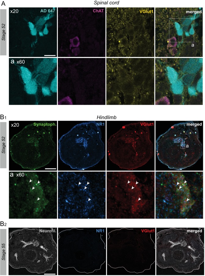 Figure 5 supplement 1. VGluT1 expression appendicular MNs. A. Fluorescence immunolabeling against ChAT (red) and VGluT1 (yellow) in limb MNs retrogradely labeled with Alexa Fluor dextran 647 (AD 647, cyan) at stage 52. Whereas ChAT is absent from retrogradely labeled MNs, VGluT1 is expressed throughout almost the entire ventral horn, including in limb MN somata. Bottom images are magnifications of the area (a) delineated by the dotted line square in the merged image at top right. Punctiform VGluT1 expression occurred around MN somata (indicating labeling of glutamatergic presynaptic terminals) and a more diffuse VGluT1 signal also appeared in MN cytoplasm surrounding cell nuclei. B. Fluorescence immunolabeling against synaptophysin (Synaptoph., green), NMDA glutamate receptor subunit 1 (NR1, blue), VGluT1 (red) and neurofilament (Neurofil., grey) in hindlimb muscle tissue at stage 52 (B1) and stage 55 (B2). VGluT1 expression colocalized with synaptophysin and postsynaptic glutamate receptors were detected at stage 52, but not at stage 54. The bottom images in B1 are magnifications of the area (a) indicated in the merged image at top right. Scale bars = 20μm. |