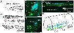 Figure 4 supplement 1. Appendicular MNs are activated centrally by cholinergic inputs. A. Immuno-labeling of putative cholinergic synapses on limb MNs retrogradely labeled with Alexa Fluor dextran 647 (AD 647), using antibodies against VAChT and the synaptic marker synapsin [mouse anti-synapsin (1:200; Synaptic Systems, Germany) revealed by secondary donkey anti-mouse antibodies coupled to Alexa Fluor 488 (1:500; Thermo Fischer)]. Both VAChT and synapsin fluorescent signals were found in close apposition surrounding MN cell bodies, indicating the presence of cholinergic input synapses. Inset: enlargement of synapsin and VAChT signals in the vicinity of an appendicular MN cell body. Scale bar = 20μm B. Calcium imaging optical recordings (20 fps) from stage 52 limb MNs retrogradely filled with Calcium Green Dextran Amine 3kD (CGDA, Invitrogen; see schematic at left) during fictive swimming (n=3). Right panel: individual calcium signals (δF/F) recorded simultaneously from 10 MN somata (encircled in x40 image at left) during a swim episode recorded from an axial VR (lower trace). C. Left panel: average fluorescence variation (black trace; ô² SEM, shaded area; top) for the 10 MNs illustrated in B during fictive swimming (bottom) in control (black) and in the presence of 50μM d-tubocurarine (d-tubo.; red). Right panel: mean calcium transient amplitudes in control (black) and under d-tubocurarine (red) expressed as a percentage of the maximal control amplitude (i.e.,δF/F peak soon after swim episode onset) for three stage 52 preparations. Unfilled circles represent single acquisitions; filled circles denote grand means ô² SEM. Long term calcium recordings were performed in control experiments without drug application to avoid any fluorescence bleaching effect. |