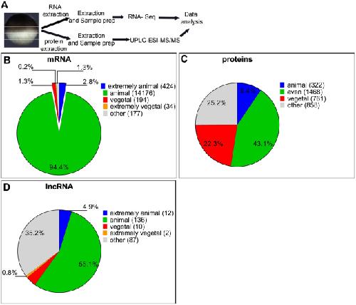Figure 7. Proteome profiling along the A-V axis of Xenopus laevis eggs. Schematic showing the experimental design (A). Protein localization and comparison with mRNA (B). Selected candidates with similar/different localization at mRNA/protein levels with known interesting biological functions (C). Comparison of protein localization at egg and blastula (D). Examples of egg and blastula specific proteins (E).