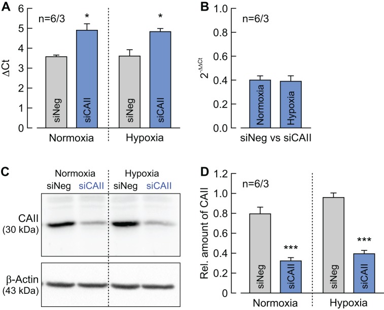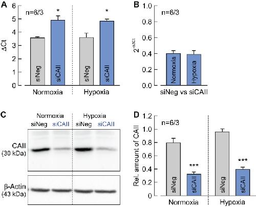 Figure 1—figure supplement 1. Determination of CAII knockdown efficiency in MCF-7 cells.(A) ΔCt values for CAII minus RPL27 of normoxic and hypoxic MCF-7 cells, treated with siRNA against CAII (blue bars) or non-targeting negative control siRNA (gray bars) (mean +SEM). *p≤0.05; Student’s t-test. (B) Relative change in the RNA level of CAII as given by the 2–ΔΔCt values for CAII in normoxic and hypoxic MCF-7 cells treated with siRNA against CAII compared to cells treated with non-targeting negative control siRNA (mean +SEM). (C) Representative western blot for CAII (upper panel) and β-actin (lower panel) from normoxic and hypoxic MCF-7 cells, treated with siRNA against CAII or non-targeting negative control siRNA. (D) Relative intensity of the fluorescent signal for CAII, normalized to the signal intensity of β-actin in the same probe (mean +SEM). The significance indicators above the bars for siCAII refer to the values of siNeg. ***p≤0.001; Student’s t-test. |