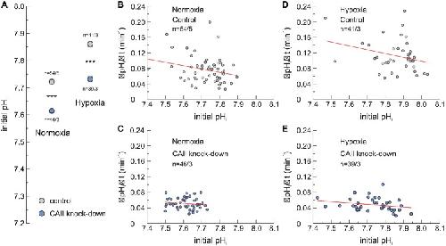Figure 1âfigure supplement 2. Influence of pHi on lactate transport.(A) Initial intracellular pH (pHi), as measured at the beginning of the experiment, of normoxic (left column) and hypoxic (right column) MCF-7 cells, treated with siRNA against CAII (blue) or non-targeting negative control siRNA (gray) (mean ± SEM). ***pâ¤0.001; Studentâs t-test. (BâE) ÎpHi/Ît during application of 3 mM lactate to normoxic (B, C) and hypoxic (D, E) MCF-7 cells, treated with either negative control siRNA (B, D) or CAII-siRNA (C, E), as shown in Figure 1B, plotted against the cells initial pHi. Every dot represents one individual cell. The red lines represent linear regression fits. |