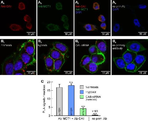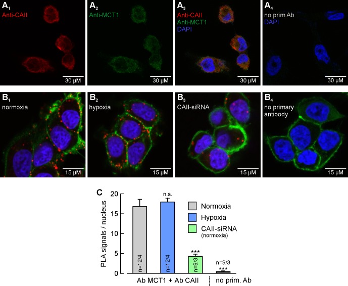 Figure 2. MCT1 and CAII are co-localized in MCF-7 breast cancer cells.(A) Antibody staining of CAII (A1) and MCT1 (A2) in MCF-7 cells. (A3) Overlay of the fluorescence signals for MCT1 (red), CAII (green) and the nuclei marker DAPI (blue). The specificity of the primary antibodies was tested by incubating MCF-7 cells only with secondary antibodies (A4). (B) In situ proximity ligation assay (PLA) of MCT1 and CAII in MCF-7 breast cancer cells, incubated under normoxia (B1) and hypoxia (B2), respectively, and normoxic MCF-7 cells in which CAII was knocked down using siRNA (B3). The red dots indicate co-localization of MCT1 and CAII with a maximum distance of <40 nm. (B4) Negative control of an in situ PLA without primary antibodies. For better visualization of the cells, F-actin was stained with fluorescence-labelled phalloidin (green). (C) Quantification of the PLA signals, shown as signals per nucleus (mean +SEM). The significance indicators above the bars refer to the values of the PLA for normoxic cells. ***pâ¤0.001, n.s. no significance; Studentâs t-test.10.7554/eLife.35176.008Figure 2âsource data 1. Original dataset for Figure 2. |