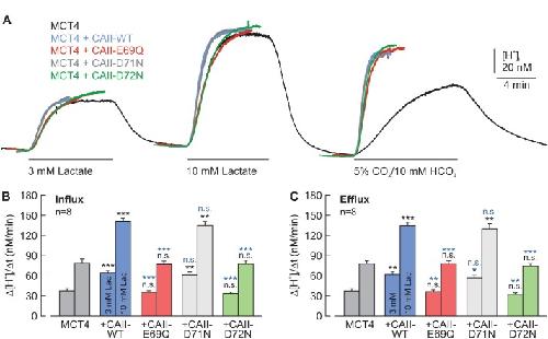 Figure 5âfigure supplement 2. Chemical rescue of the interaction between MCT4 and CAII-E69Q/D72N by 4-methylimidazole.(A, B) Rate of change in intracellular H+ concentration (Î[H+]/Ît) as induced by the application (A) and removal (B) of 3 and 10 mM lactate, respectively, in oocytes expressing MCT4 (dark gray), MCT1 + CAII-WT (blue), MCT4 + CAII-E69Q (red), MCT4 + CAII-D71N (light gray), and MCT4 + CAII-D72N (green), in the presence of 4-MI in the cytosol (mean + SEM). The black significance indicators refer to MCT4, the blue significant indicators refer to MCT4 + CAII-WT. (C) Lactate-induced proton flux (JH), as calculated from the rate of change in pHi and the cells' intrinsic buffer capacity (βi; Figure 4âfigure supplement 1). The significance of difference indicators above the bars from 4-MI-injected oocytes refer to comparisons with the cells expressing the same proteins without 4-MI. *pâ¤0.05, **pâ¤0.01, ***pâ¤0.001. n.s. no significance; Studentâs t-test. |